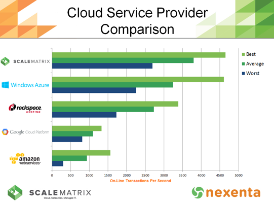 ScaleMatrix, in partnership with Nexenta, conducted cloud performance trials at the company’s advanced data center in San Diego. A variety of cloud workloads and applications were tested against a number of traditional hosting service platforms. The results were compared against ScaleMatrix’ performance cloud service, driven by Nexenta and SanDisk.